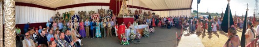 Fotografía 2. Una panorámica de la Misa de Romeros en la Romería de 2022, con los Simpecados de todas las hermandades arropando a la Virgen del Rocío.