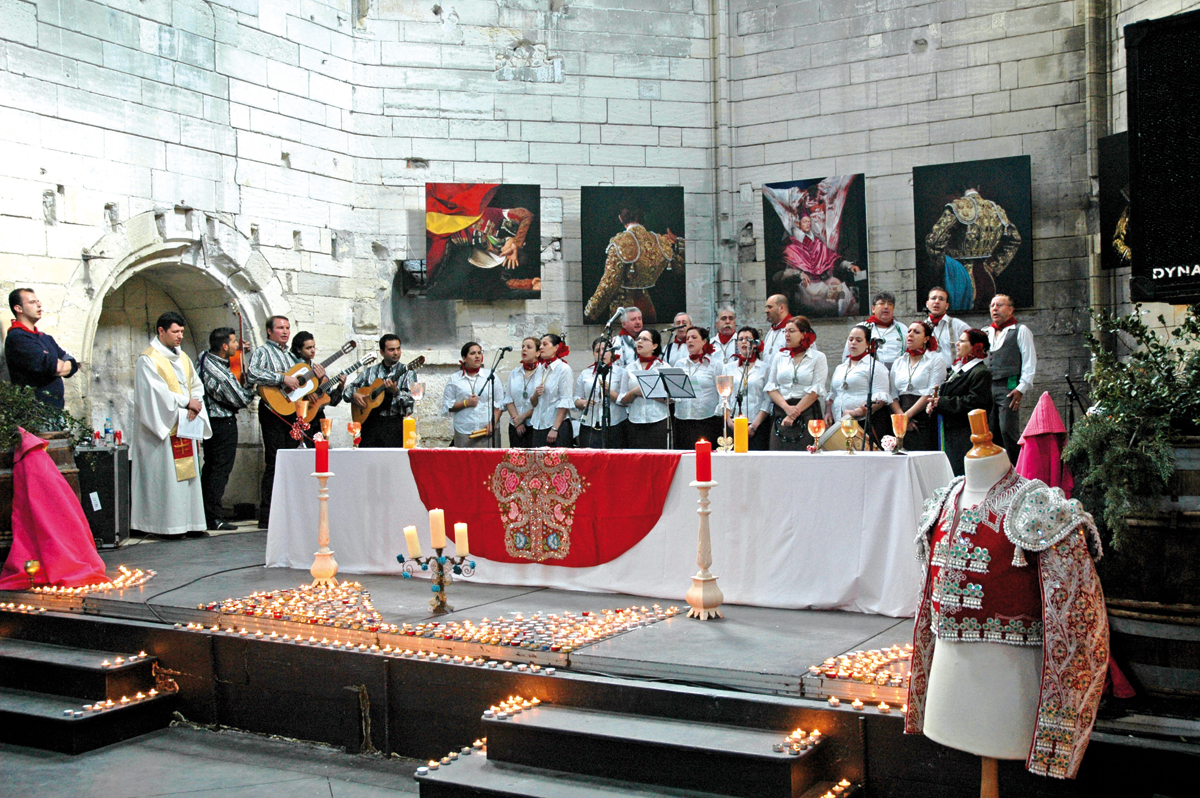 Fotografia 2. El cor de l’Hermandad Nuestra Señora del Rocío Los Romeros, al costat del grup Gypsi King, durant la celebració de la missa a Arlés. La germanor va entaular una bonica relació amb la Penya Taurina “Els Andalouses” de la localitat francesa, que els havia visitat prèviament a Barcelona.